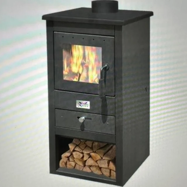In acciaio da Mm. 8 verniciato, piano superiore maggiorato con imbocco innesto tubo scarico fumi. Camera combustione a 6 mattoni refrattari; doppio perno longitudinale che incerniera lo sportello con dispositivo a scorrimento orizzontale per una corretta carburazione della combustione, con speciale vetro ceramico per alte temperature fino a 800°C. Maniglia a snodo indipendente ed impugnatura in gomma siliconica resistente fino a 600°C. Cassetto totalmente asportabile per agevolare raccolta ceneri residue posto nella parte inferiore della camera di combustione. Dimensioni: Mm. 330x350x940. Diametro scarico fumi superiore Mm. 130. Peso: Kg. 42.